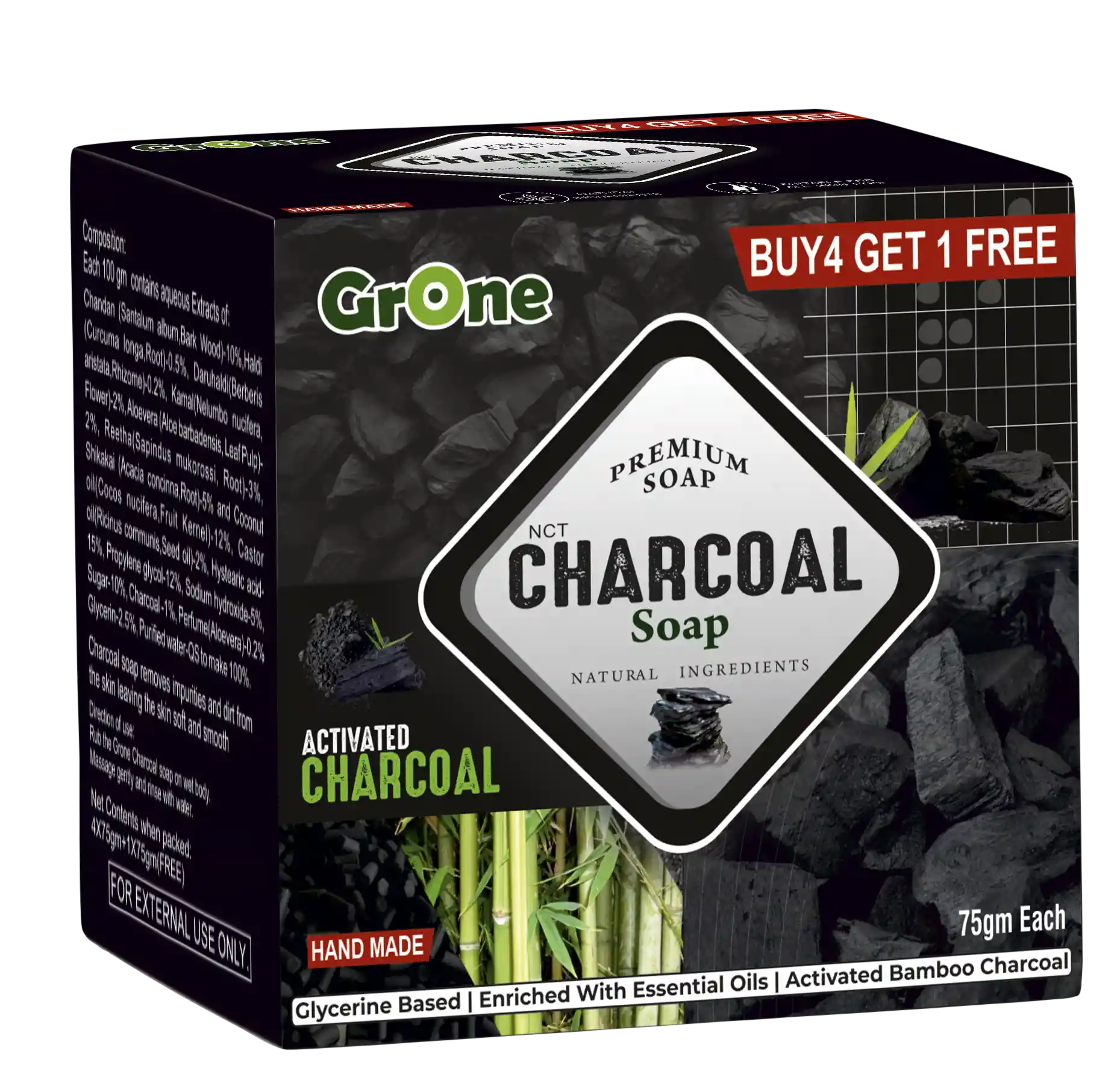 Soap Charcol (75g,Pack of 4+1 Pack Free)
